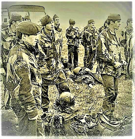 HAVING PARACHUTED WITH EQUIPMENT ONTO THE DZ, WE’RE NOW WAITING FOR THE FINAL STICK TO JUMP…THIS IS MY FAMILY I’M SURROUNDED BY!
