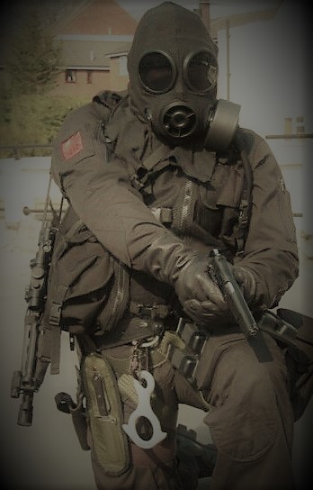 1990s Anti Terrorist Assault Group member with pistol and submachine gun.