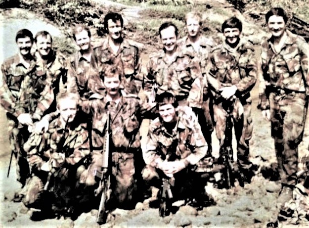 The Training Wing team after a shave and brush up awaiting the choppers to get out from the jungle, mid 1980s.