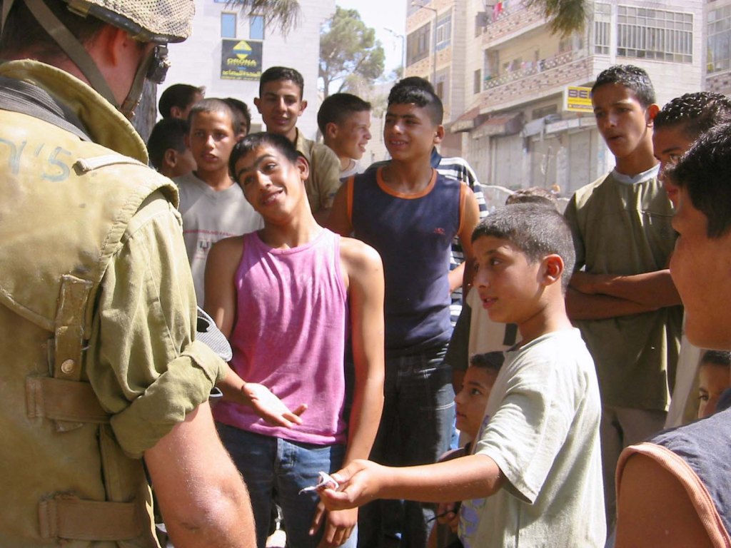 An Israeli soldier offered sweets from Palestinian children, later they were kicking a football with one another…they realised for a moment that they were all young and all the same. West Bank 02.