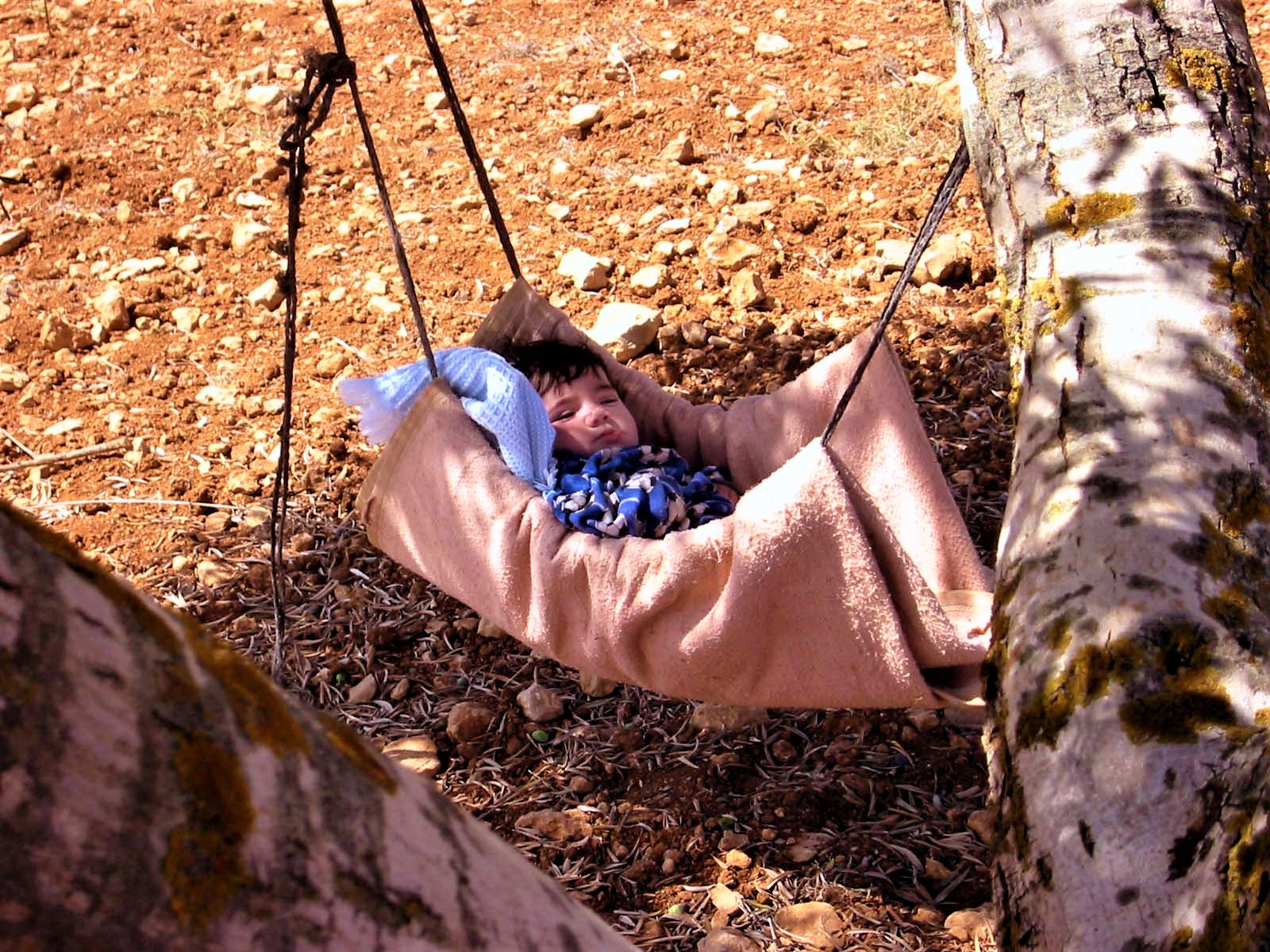 A baby sleeps tight under the bow of an ancient olive tree. Nablus 2002.