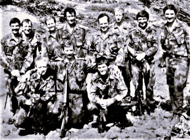 22 SAS Training Wing staff, mid-1980s. End of an eight-week selection jungle phase, last men out. Washed, shaved, and waiting for the chopper to go back to the real world. Vince is standing on the extreme right.