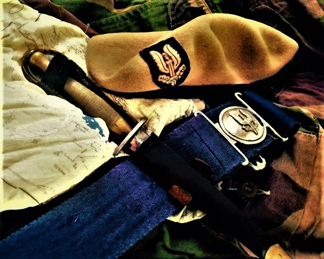 Beret, Regimental belt, escape map, and fighting knife.