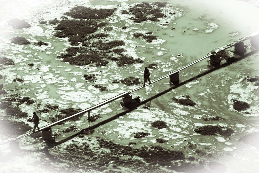 Crossing narrow bridge, Kabul river, 04
